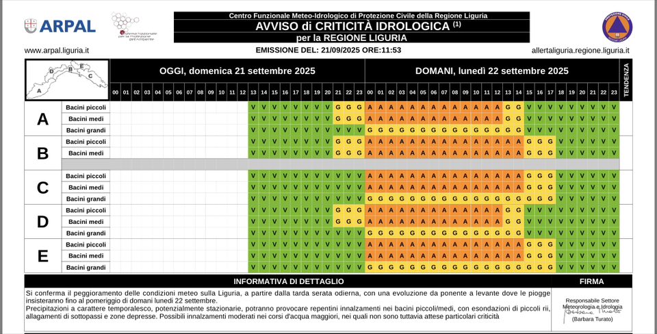 Si comunica che la Regione Liguria ha emesso un avviso di ALLERTA ARANCIONE per temporali e piogge diffuse dalla mezzanotte di oggi fino alle ore 13 di domani, lunedì 22/9. Sarà invece ALLERTA GIALLA dalle 20 di oggi fino alle 24 e dalle 13 alle 15 di domani. Previsto tempo perturbato fin dalle prime ore della prossima notte, con piogge diffuse di intensità fino a forte e cumulate fino a elevate. Alta probabilità di temporali forti, organizzati e persistenti, anche accompagnati da locali colpi di vento e grandinate. Attenuazione dei fenomeni nel pomeriggio a partire da Ponente. Venti forti (50-60 km/h).